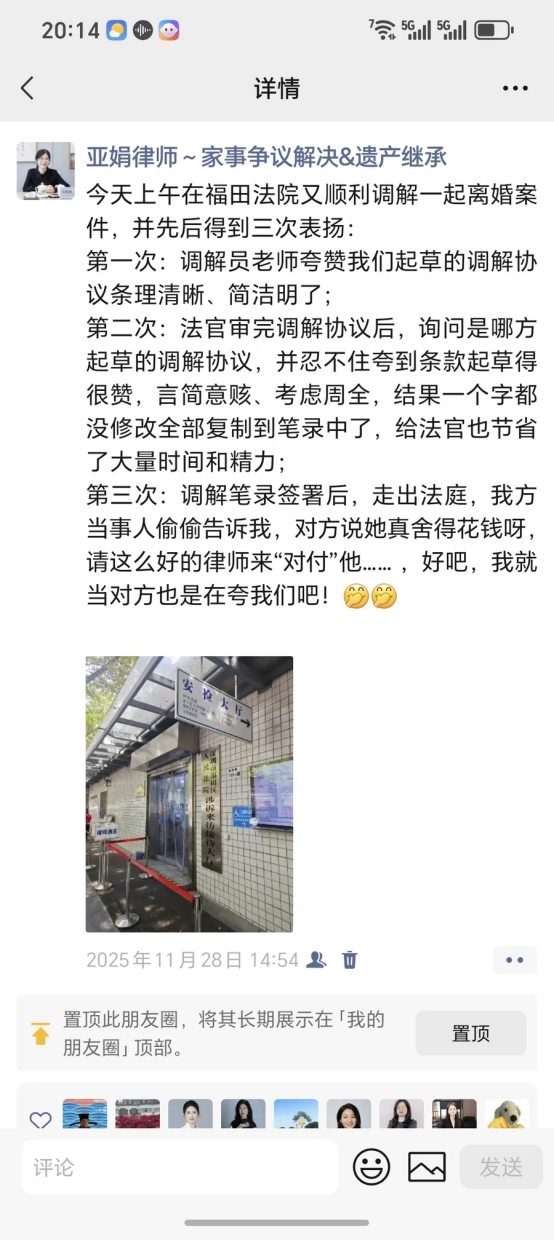 在福田法院,我代理的一起离婚案,更是先后得到了调解员、法官,甚至对方当事人的三次 “表扬”。十余载的办案经验让我深知法律文书的严谨性,起草的调解协议条理清晰、言简意赅,被法官一字未改地复制到笔录里,为法官节省了大量时间和精力;而对方当事人那句 “真舍得花钱,请这么好的律师来对付我”,我更权当是对我十余年专业积累的最高褒奖。