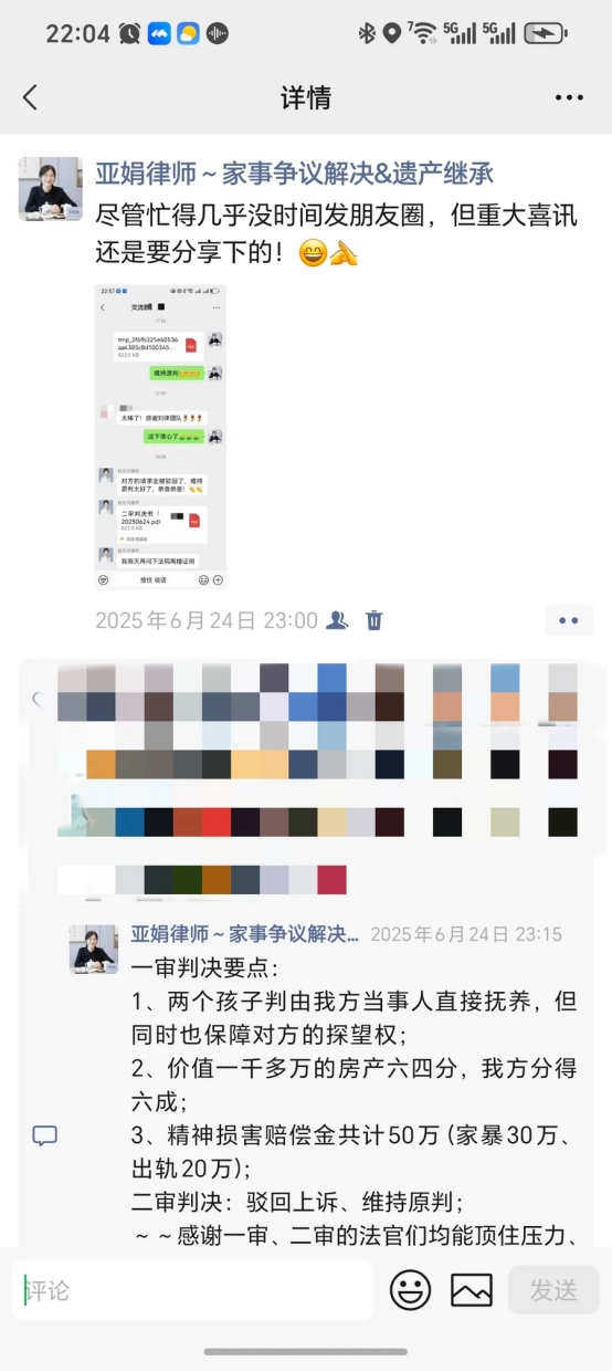 在一起婚姻过错案件中,我凭借多年处理婚姻过错纠纷的实务经验,为当事人全力争取合法权益,最终法院支持我方 30 万元精神损害赔偿与 20 万元过错损害赔偿。一审判决中,两个孩子判由我方当事人直接抚养,同时保障对方探望权;价值一千多万的房产按六四分分割,我方分得六成;50 万的过错损害赔偿全额支持,二审判决更是驳回上诉、维持原判。用法律为受伤的一方讨回应有的尊严与补偿,让我更加坚信:婚姻里的伤害,从来都不是无声无息,十余年的专业坚守,就是为了让法律为每一份委屈撑腰。