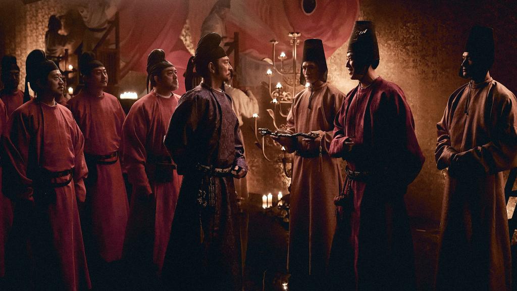 摄影团队则将中国传统绘画“散点透视”的技法运用到画面中——并不以常见的广角镜头展示长安的磅礴气势,而是使用长焦镜头展现建筑、环境和人物的关系,达到留白的效果。比如影片中李善德为获得批文来回奔波,小小的身影与偌大的皇城形成鲜明对比,高耸的建筑衬托出李善德的“微不足道”。